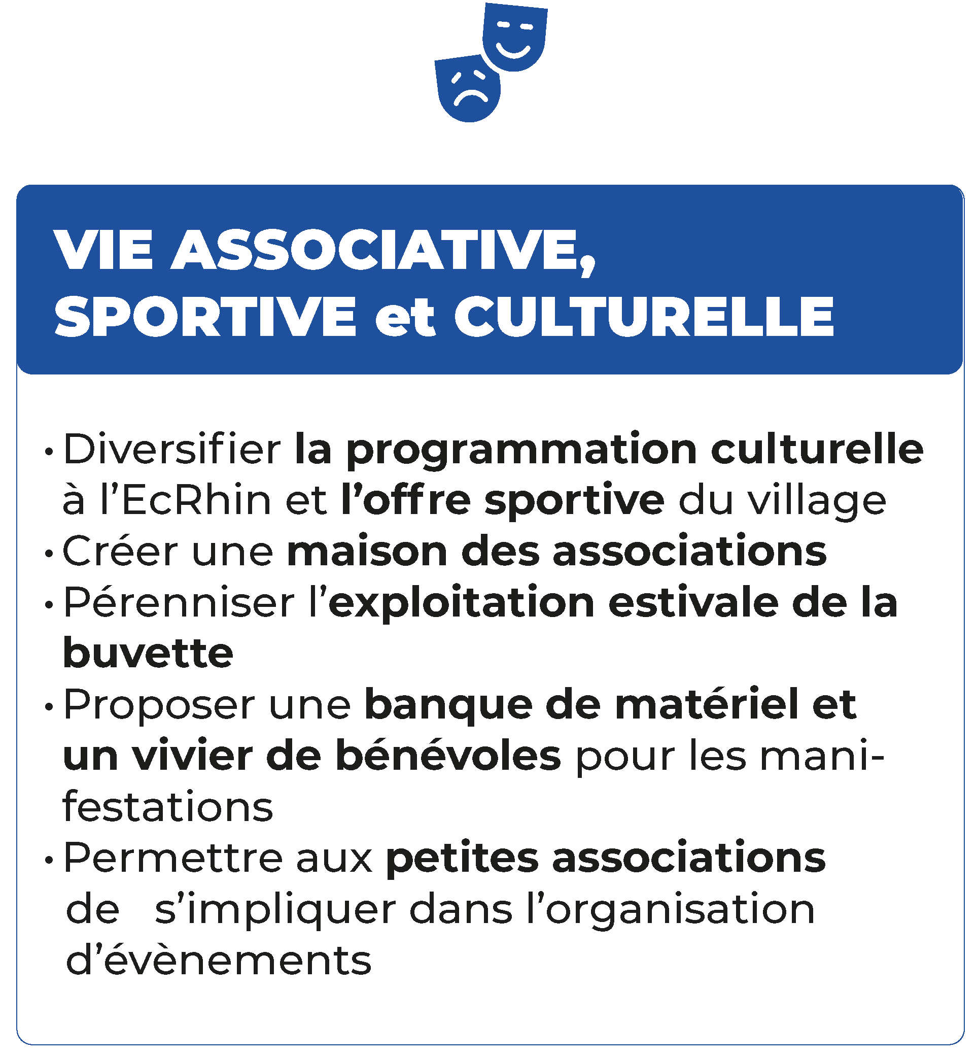 Notre programme Nous vous proposons un programme complet et détaillé, construit à partir de vos attentes et nourri par les contributions recueillies lors de notre enquête citoyenne. Fidèles à nos valeurs, nos priorités sont le soutien à la vie associative, le bien-être de tous, la sécurité, la préservation de notre cadre de vie, la valorisation de notre patrimoine ainsi que la protection de notre environnement. Notre ambition est de conduire ce programme avec responsabilité, dans le respect des capacités financières communales et avec la volonté de maîtriser la fiscalité. Vie associative, sportive et culturelle Vie associative, sportive et culturelle