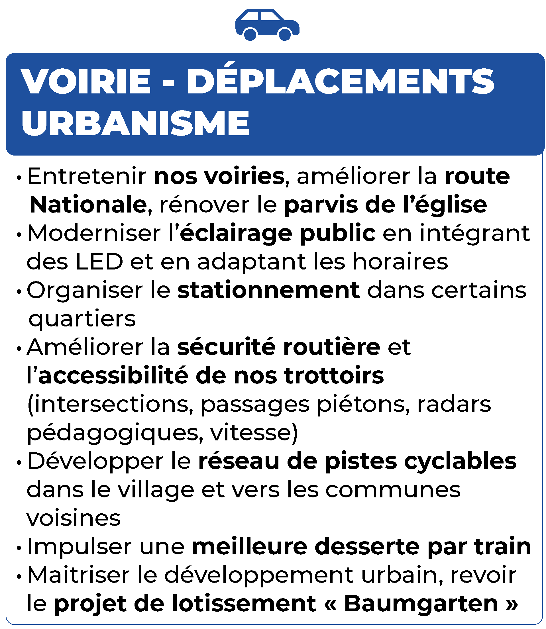 Nous optimiserons notre patrimoine communal existant au travers d’une démarche durable. Nous trouverons un avenir pour les divers bâtiments qui ont été achetés par le passé et qui dépérissent. Voirie-déplacements, urbanisme Voirie-déplacements, urbanisme
