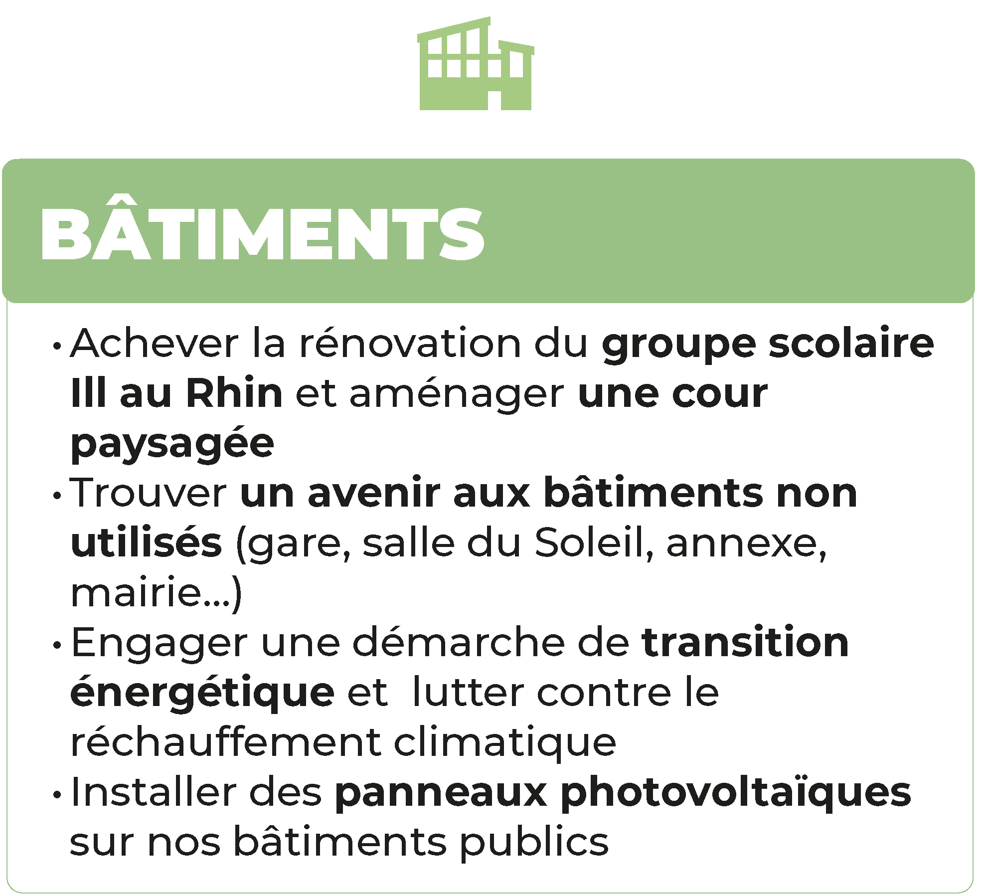 Nous optimiserons notre patrimoine communal existant au travers d’une démarche durable. Nous trouverons un avenir pour les divers bâtiments qui ont été achetés par le passé et qui dépérissent. Voirie-déplacements, urbanisme Voirie-déplacements, urbanisme
