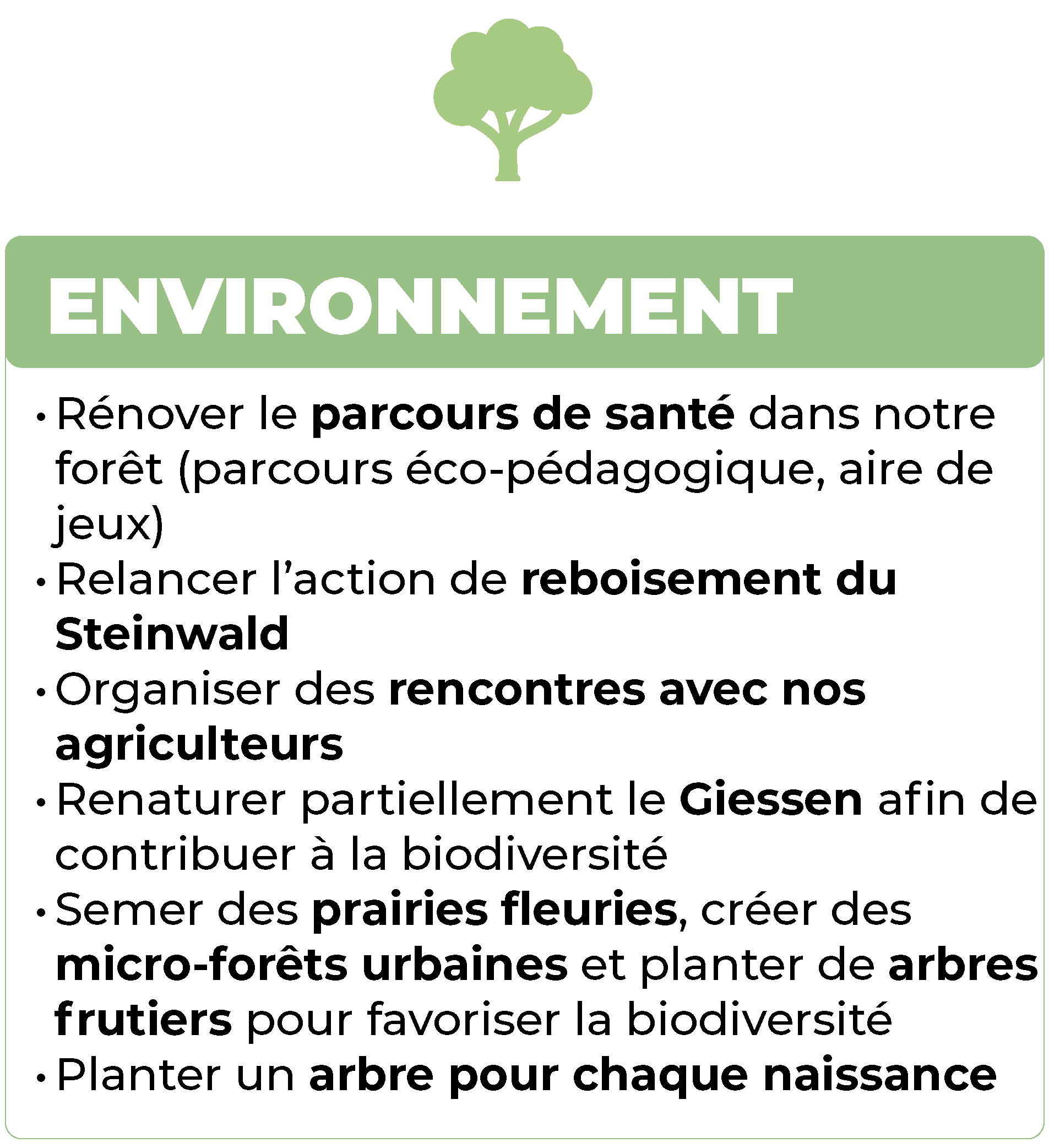 Nous rénoverons les agrès et l’aire de jeux du parcours de santé de la forêt du Steinwald et nous créerons un itinéraire éco-pédagogique. Nous relancerons une action de reboisement du Steinwald suite à la maladie de la chalarose qui décime les frênes. Nous organiserons des rencontres régulières avec nos agriculteurs afin de créer du dialogue, de valoriser leur travail et de construire ensemble des solutions durables. Nous engagerons une renaturation partielle du Giessen pour favoriser la biodiversité et redonner vie à ce cours d’eau. Nous développerons des prairies fleuries, des micro-forêts urbaines et planterons des arbres fruitiers pour enrichir notre patrimoine naturel. Nous planterons un arbre pour chaque naissance : un geste symbolique et durable pour relier les générations et inscrire chaque enfant dans l’histoire vivante de notre commune. Loisirs-Tourisme