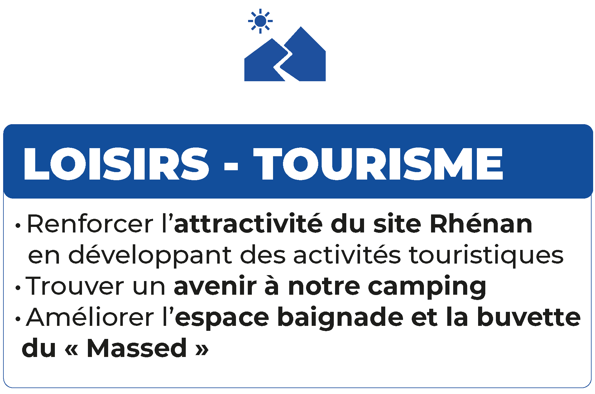 Nous renforcerons l’attractivité du site Rhénan en développant des activités touristiques et ludiques adaptées à tous les publics. Nous améliorerons l’espace baignade du Massed pour garantir sécurité et confort aux familles et aux activités nautiques. Nous valoriserons notre camping en améliorant les infrastructures.