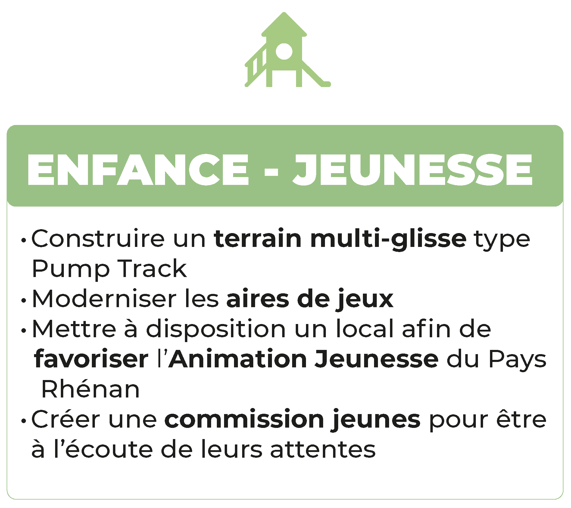 Nous construirons une piste de Pump Track pour offrir un espace ludique et sportif pour les enfants et adolescents (à vélo, roller, trottinette, skate) Nous moderniserons nos aires de jeux afin de garantir des installations sécurisées et attrayantes, adaptées aux besoins des enfants de tout âge. Nous créerons une commission de jeunes pour un partage d’idées et d’attentes. Nous donnerons la possibilité aux jeunes de se retrouver dans un local, afin de favoriser l’Animation Jeunesse du Pays Rhénan. NOS AINES – ACTION SOCIALE NOS AINES – ACTION SOCIALE
