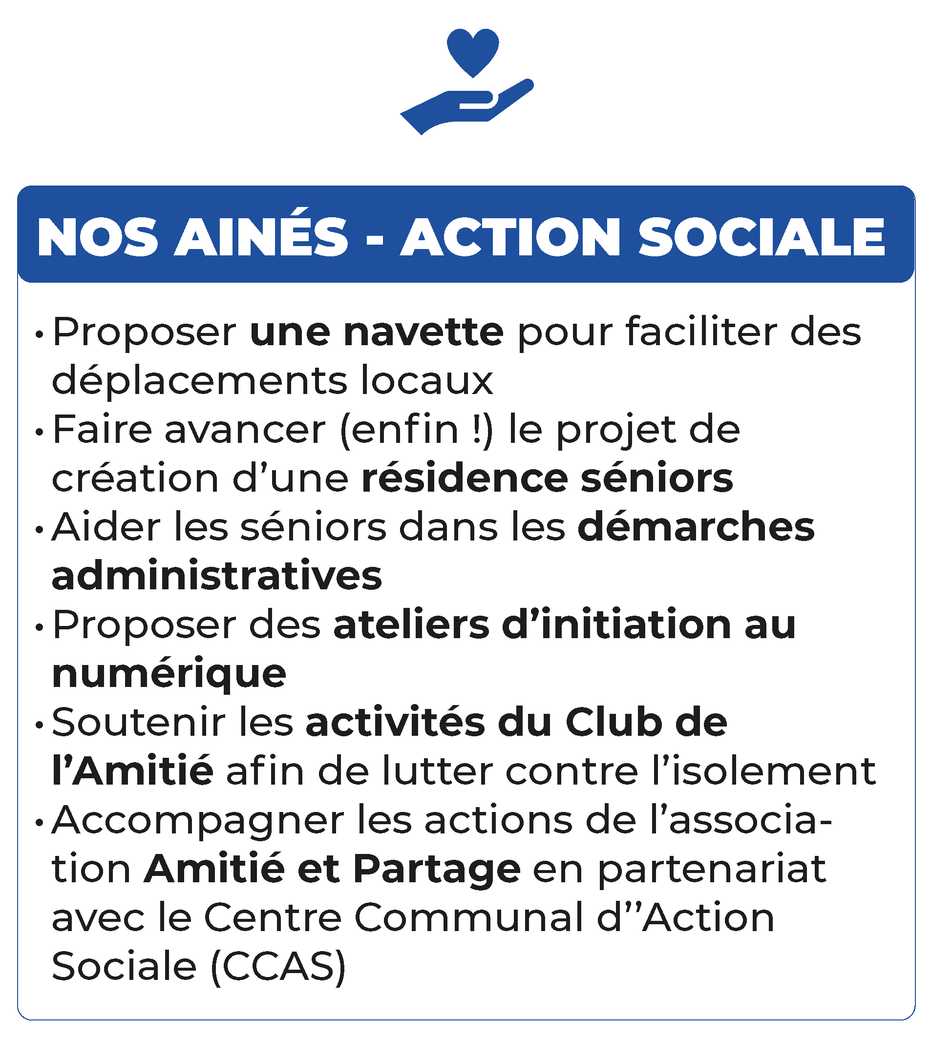 Nous remettrons le projet de résidence senior à plat et impulserons un nouvel élan après les 10 ans de tergiversations. La démographie montre qu’il y aura une forte augmentation du nombre de nos ainés, c’est un sujet majeur du mandat à venir. Les enjeux sont multifocaux, hébergement, déplacements, aides administratives et numériques, aides sociales. Nous serons pleinement engagés aux côtés des associations directement impliquées dans le quotidien de nos ainés et dans l’action sociale. Communication