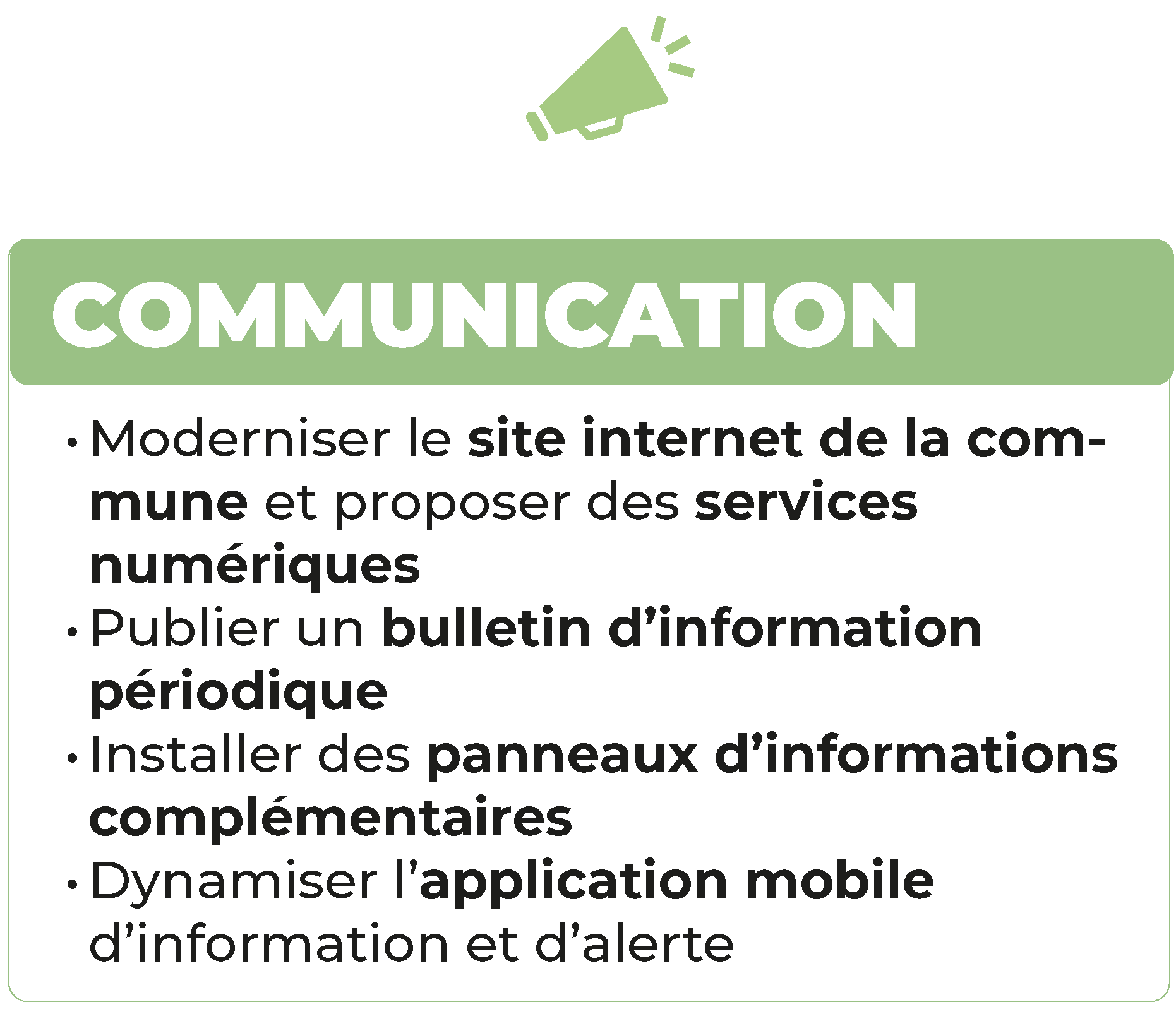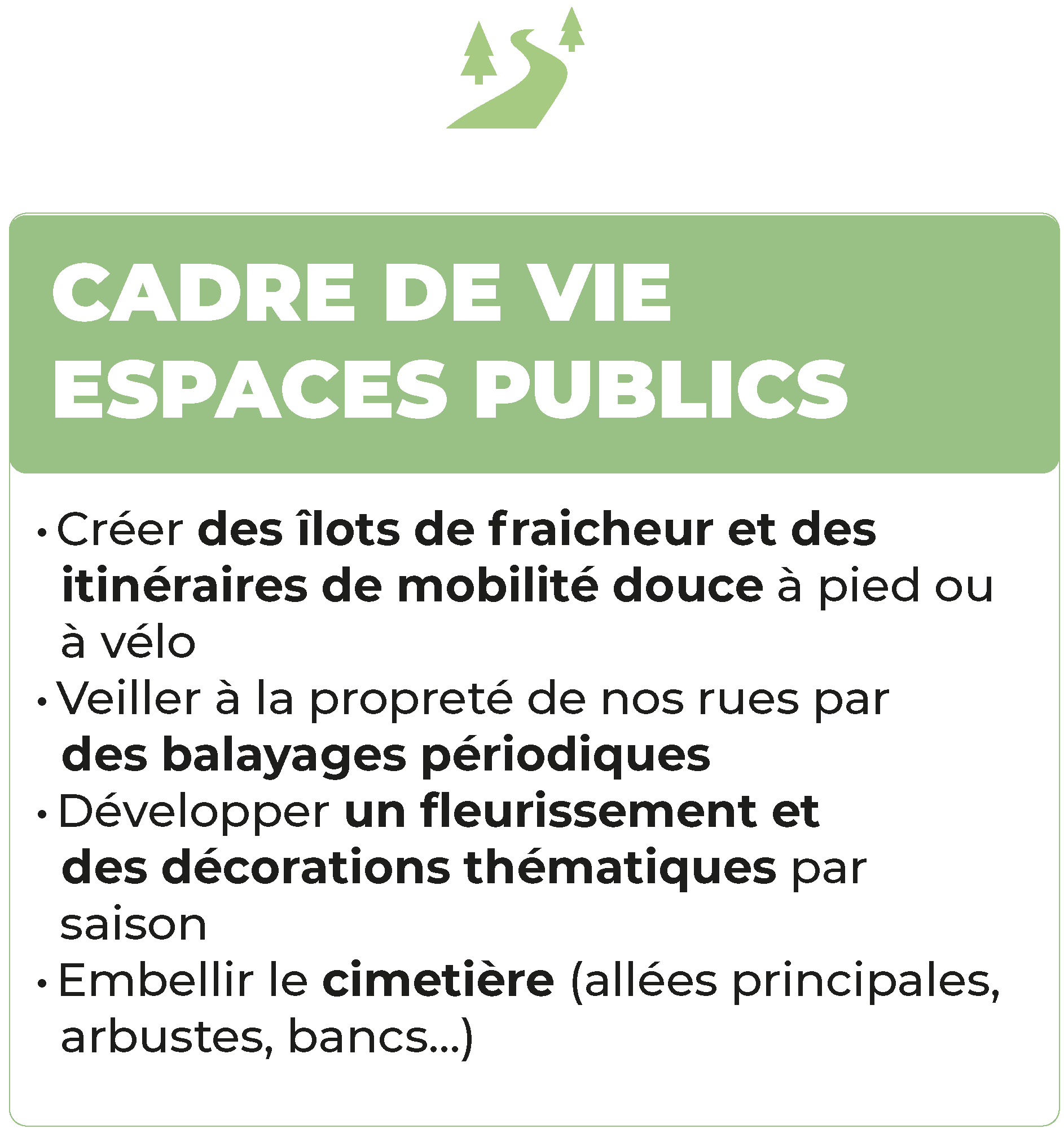 Nous publierons un bulletin périodique d’informations comprenant un planning des événements. Nous développerons des plateformes numériques pour recueillir les avis et suggestions des habitants sur les projets municipaux. Nous dynamiserons l’application mobile d’information et d’alerte. Cadre de vie et espaces publics Cadre de vie et espaces publics
