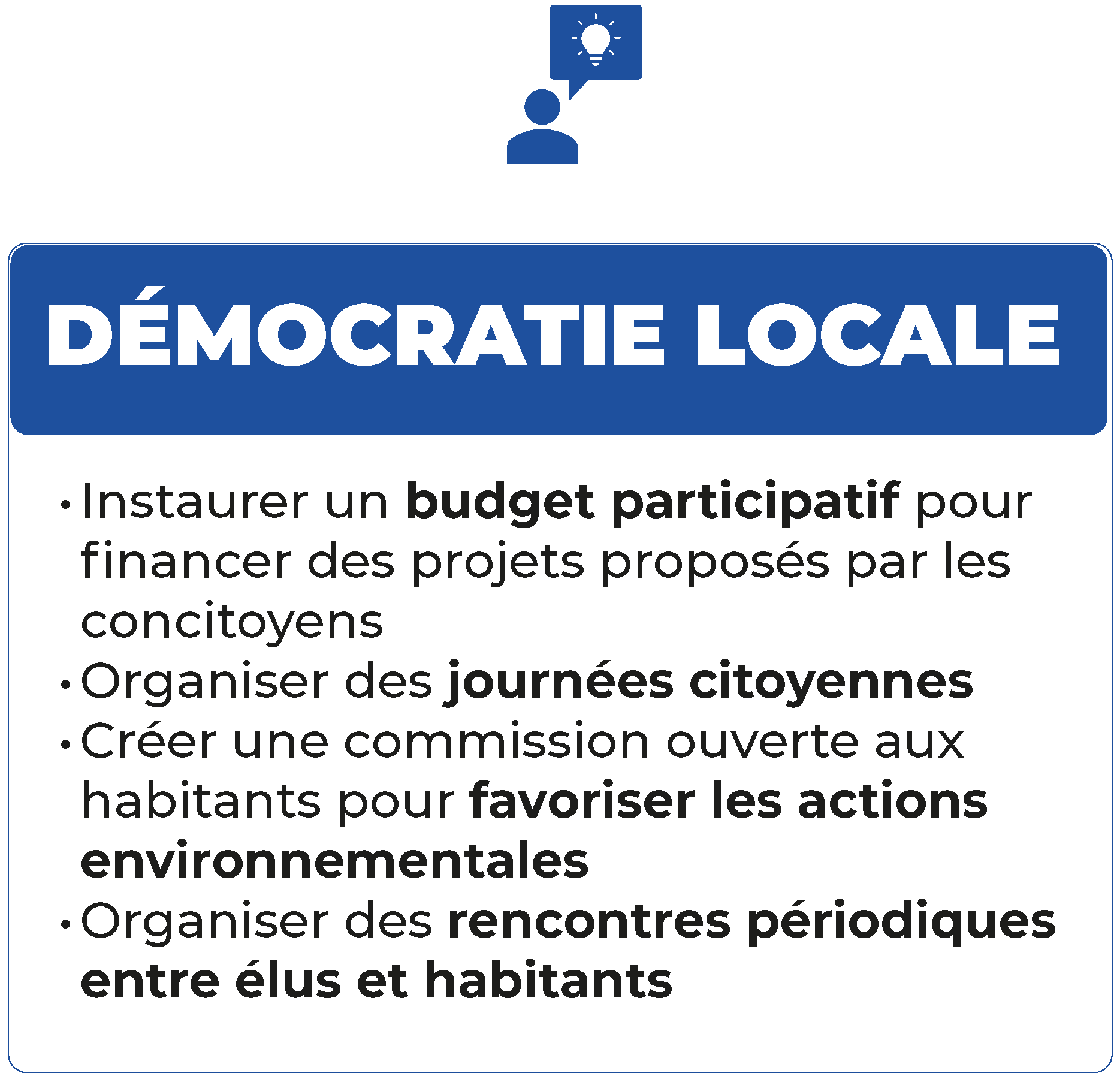 Nous créerons des îlots de fraîcheur et développerons des itinéraires de mobilité douce pour favoriser les déplacements à pied et à vélo en toute sécurité. Nous veillerons à la propreté de nos rues grâce à des balayages périodiques et une attention constante à l’entretien des espaces publics. Nous renforcerons le fleurissement du village et proposerons des décorations thématiques au fil des saisons pour embellir notre cadre de vie. Nous engagerons également un programme d’embellissement du cimetière, avec l’amélioration des allées principales, la plantation d’arbustes et l’installation de bancs, afin d’en faire un lieu apaisant. Démocratie locale