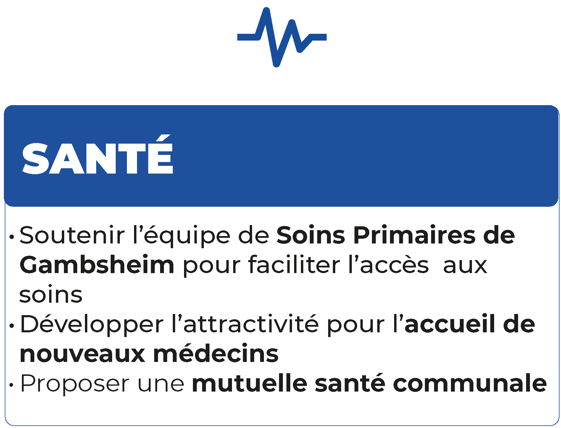 Lorsque l’on parle de santé on pense à la qualité des soins, mais le véritable enjeu des années à venir est l’accès aux soins. Dans un contexte de pénurie, notamment de médecins généralistes, nous tenterons de trouver des solutions et d’impulser l’installation de nouveaux professionnels de santé. Cela passe également par un travail commun avec notre ESP (équipe de soins primaire) directement concernée, compétente et déjà engagée sur le sujet. La santé a un coût, nous savons tous l’effort demandé aux ménages pour accéder à une mutuelle satisfaisante. Nous proposerons une mutuelle santé communale pour justement mutualiser les demandes et faire baisser les coûts sans faire baisser les prestations. Vie économique