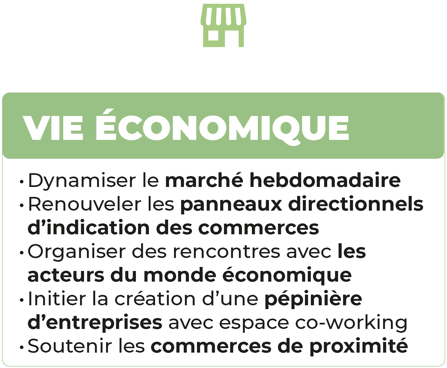 Nous dynamiserons le marché hebdomadaire pour une meilleure attractivité avec des animations, une communication renforcée tout en soutenant les commerçants. Nous renouvèlerons les panneaux directionnels d’indication des commerces pour améliorer leur visibilité et faciliter l’orientation des clients. Nous organiserons des rencontres avec les acteurs du monde économique afin de créer un réseau solide entre commerçants, artisans, industriels et institutions. Nous initierons la création d’une pépinière d’entreprises avec un espace coworking. Sécurité